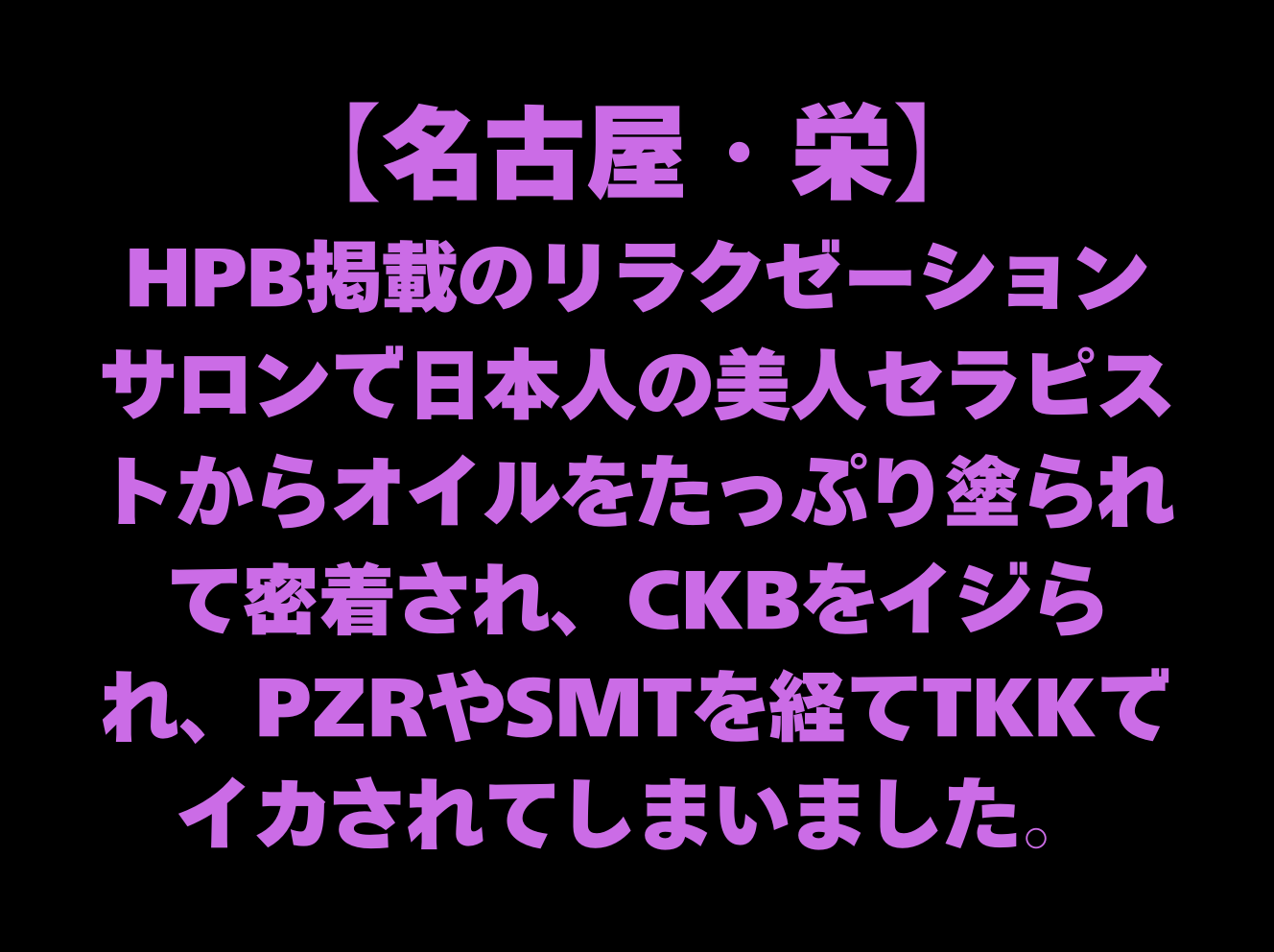 『HPB掲載のリラクゼーションサロンで日本人の美人セラピストからオイルをたっぷり塗られて密着され、CKBをイジられ、PZRやSMTを経てTKKでイカされてしまいました』