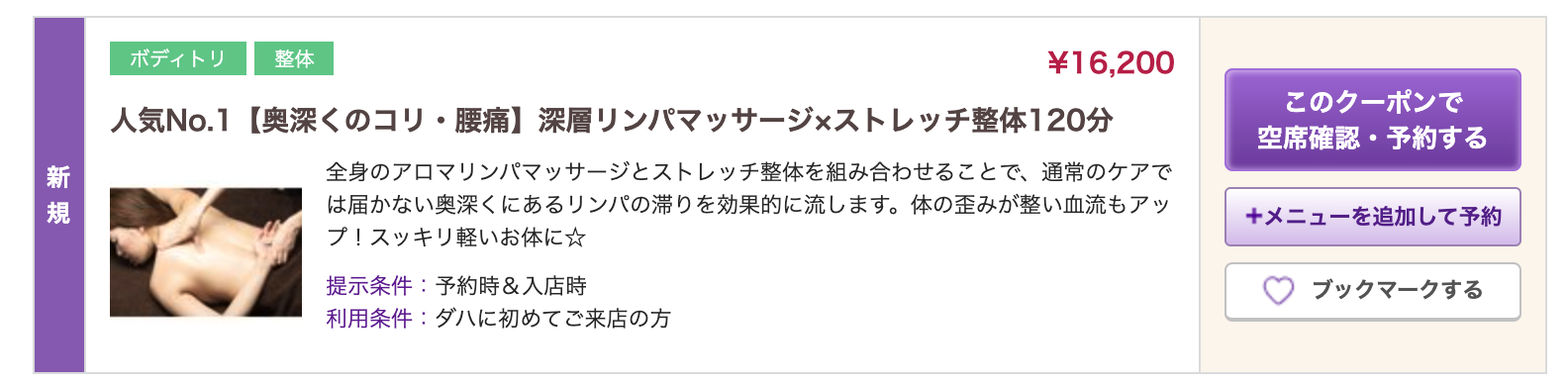 今回は、人気ナンバーワンと銘打ってあった「深層リンパマッサージ×ストレッチ整体120分」のコースを選びました。